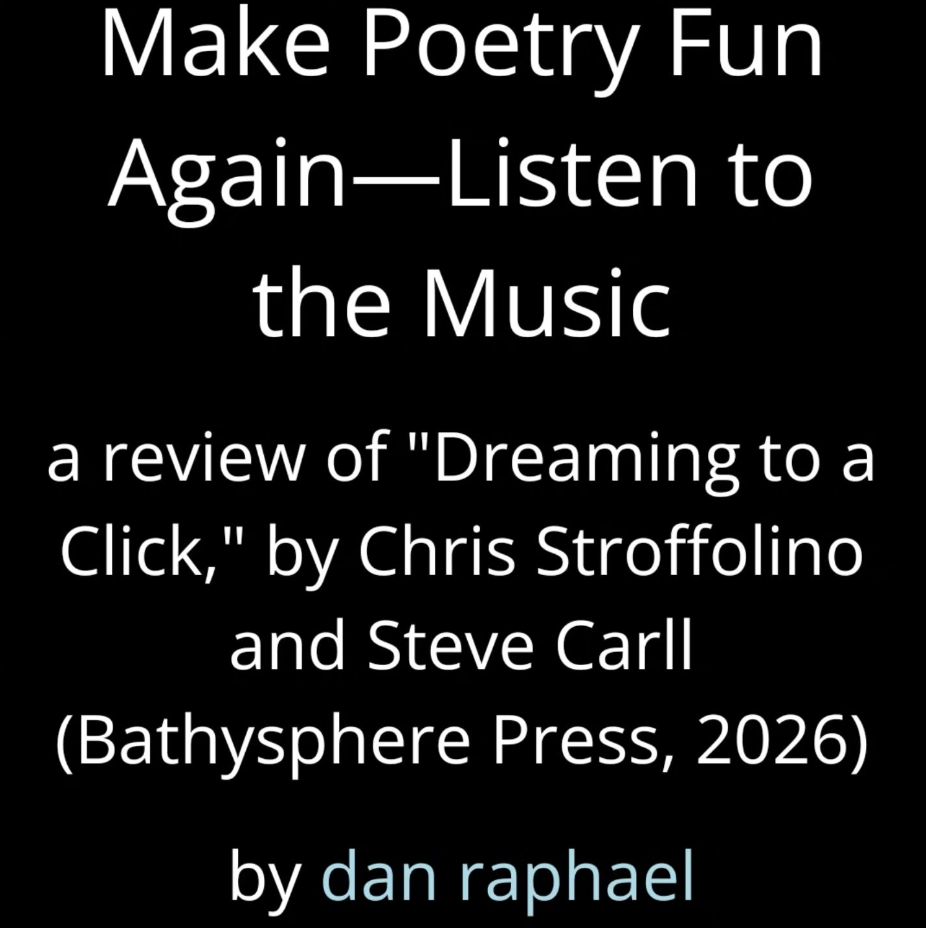 "Dreaming to a Click", the music-themed poetry book Chris Stroffolino and I wrote, just got reviewed in Unlikely Stories Six at https://www.unlikelystories.org/content/make-poetry-fun-again-listen-to-the-music Thanks to reviewer dan raphael and Unlikely Stories editor-in-chief Jonathan Penton. To order the book, message me here or email me at stevecarll67@gmail.com #poetry #music
