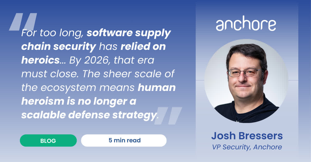If your defense strategy relies on late-night triage sessions, it's time to build a better system. Anchore VP of Security, Josh Bressers explains why 2026 is the end of the "hero era": https://anchore.com/blog/no-crystal-ball-but-2026-directions/