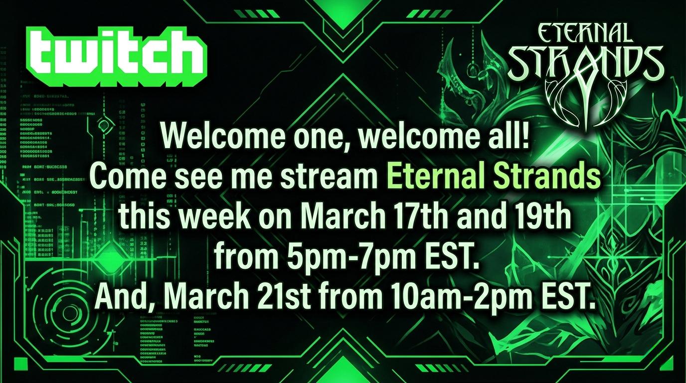 Episode 4 of my streaming will be occuring this coming Tuesday, March 10th, 2026 from 5pm-7pm EST. In continuation of playing Eternal Strands! Currently backtracking between Glintwood Hollow and the Dreger's Mite. In search of crafting recipes for better weapons, armor, and new strands (powers) in taking down new and powerful foes.